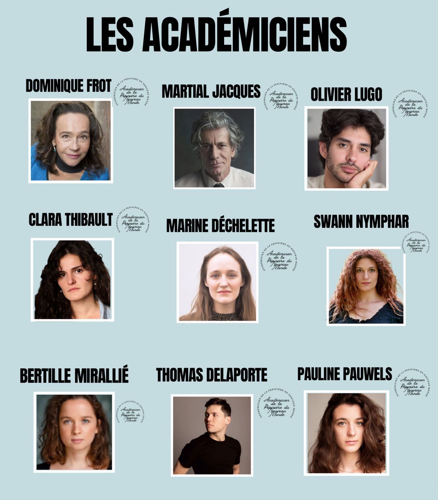 Les "académiciens" de la Pépinière sont des acteurs qui ont gagné un concours pour entrer à la Pépinière en tant que jeunes talents. Invités à la Pépinière pour une durée variant de une année à cinq ans, leurs parcours singuliers et les compétences qu'ils apportent à la Pépinière permettent de leur réserver cette place particulière. Ils viennent souvent d'écoles nationales prestigieuses (ESCA, CNSAD...).